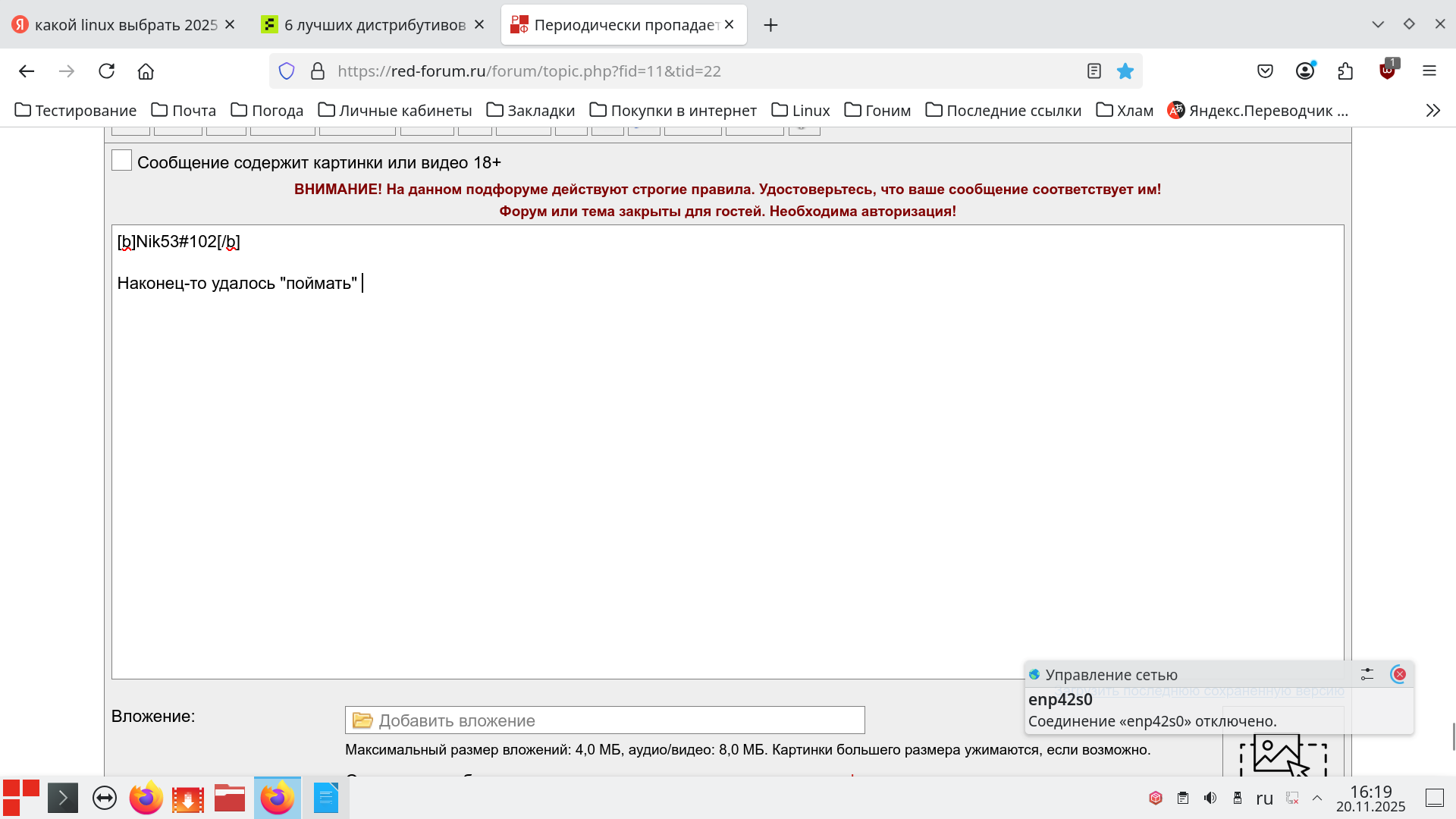 Факир был пьян и фокус не удался, на вторые сутки увидел до боли знакомое сообщение "Проводное соединение отключено", и буквально, через секунду - "Проводное соединение восстановлено". Проводная сеть, как отваливалась, так и отваливается, рано обрадовался. Я в далёком прошлом ведущий инженер сборочного цеха радиозавода и далеко не понаслышке знаю, что такое "периодически возникающая неисправность", или как сейчас говорят "плавающий дефект". Я знаю, что необходимо, чтобы от этого избавиться, но уже около года не могу найти, как это сделать. Короче, терпеть такие проблемы уже надоело, надо отказываться от RedOS в пользу Alt Linux, а RedOS отправлять в архив до того времени, как будет найдено решение этой проблемы. PS: Во в время набора этого сообщения, проводная сеть снова "отвалилась" и, спустя секунду, соединение восстановилось, успел сделать скриншот только восстановления соединения. ... |