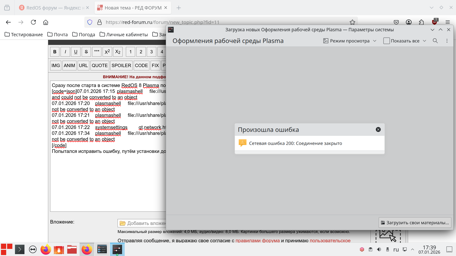 Сразу после старта в системе RedOS 8 Plasma появляются ошибки, связанные с темой оформления: Код: JSON 1. 2. 3. 4. 5. И так несколько раз подряд, но сеть работает и связь с интернет есть. ... |